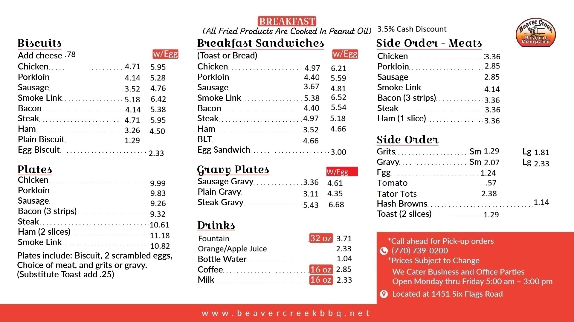 Monday thru Friday 5:30 am - 3:00 pm Saturday CLOSED